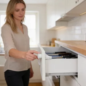 Adoro como ficam escondidas. Os convidados não percebem nada, mas nosso filho não consegue abrir a gaveta de remédios. A instalação levou uns dez minutos para todas as quatro travas.
