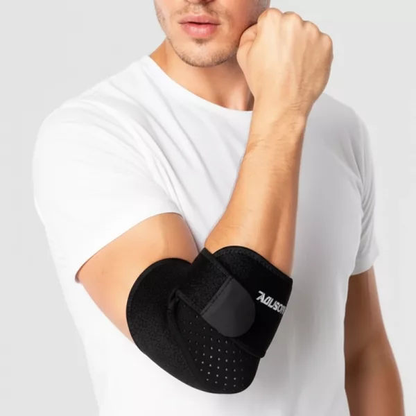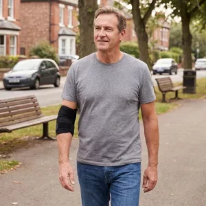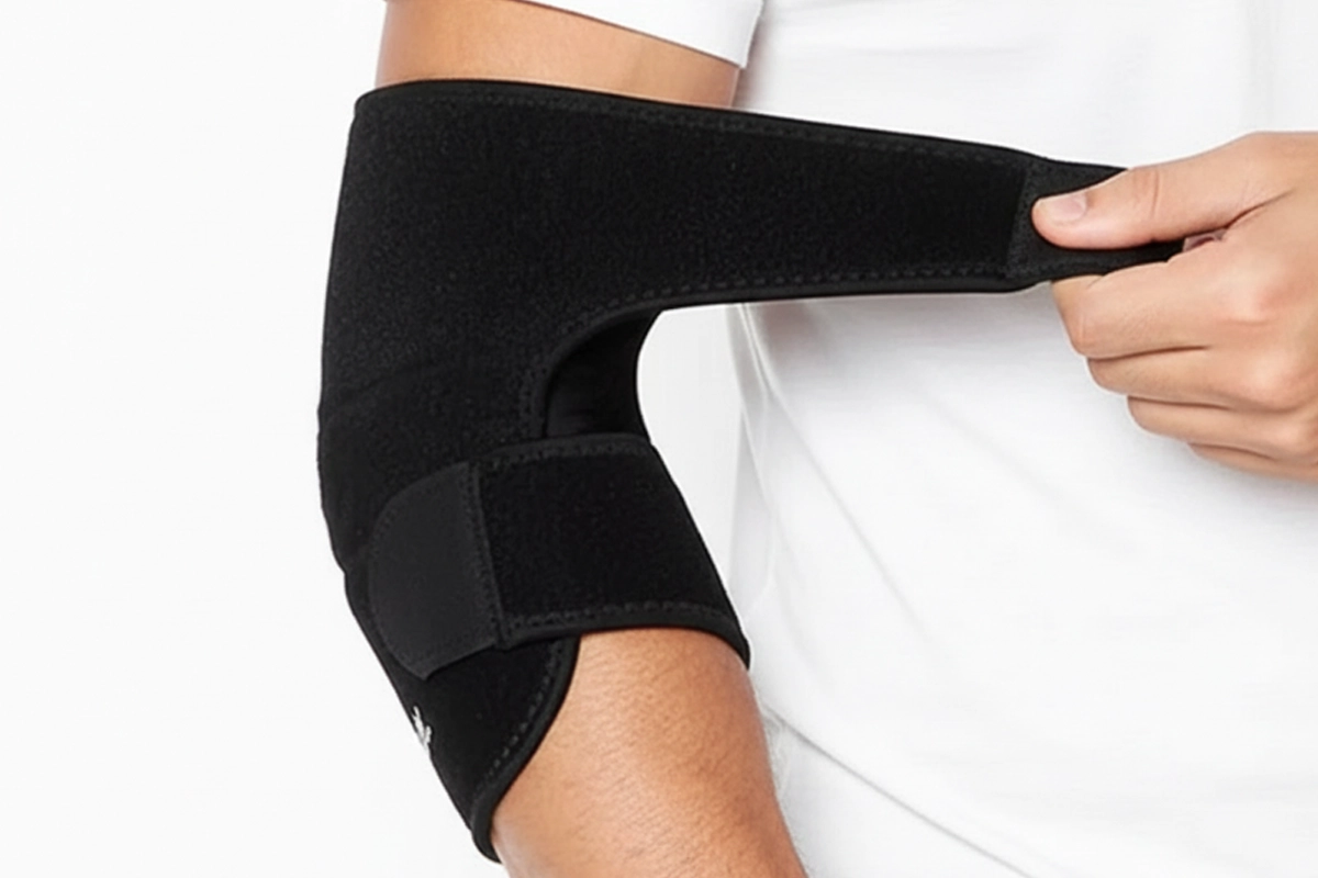 Gosto de poder ajustar facilmente. Fica no lugar enquanto cuido do jardim ou passeio com meu cachorro, e meu cotovelo fica ótimo.