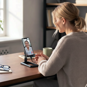 Honestamente, este suporte de celular salvou meu pescoço durante longas sessões de estudo. Adoro como é fácil ajustar e dobrar quando termino.