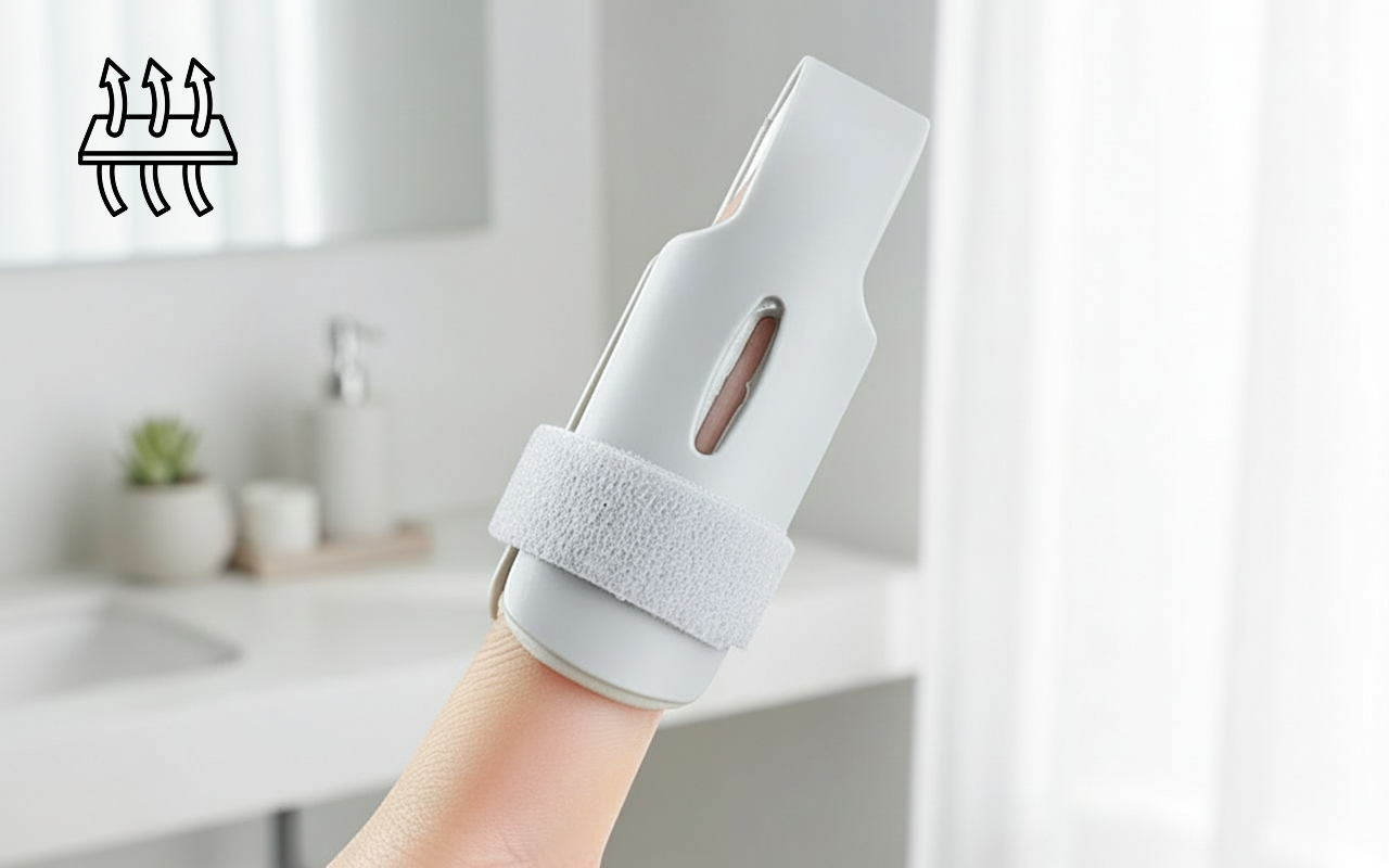 Orifícios especiais permitem o fluxo de ar facilmente, mantendo a pele fresca e seca. Use a tala de dedo Ortorex por mais tempo sem suar ou sentir coceira.
