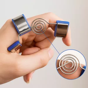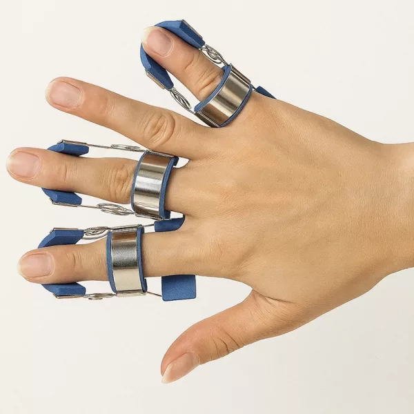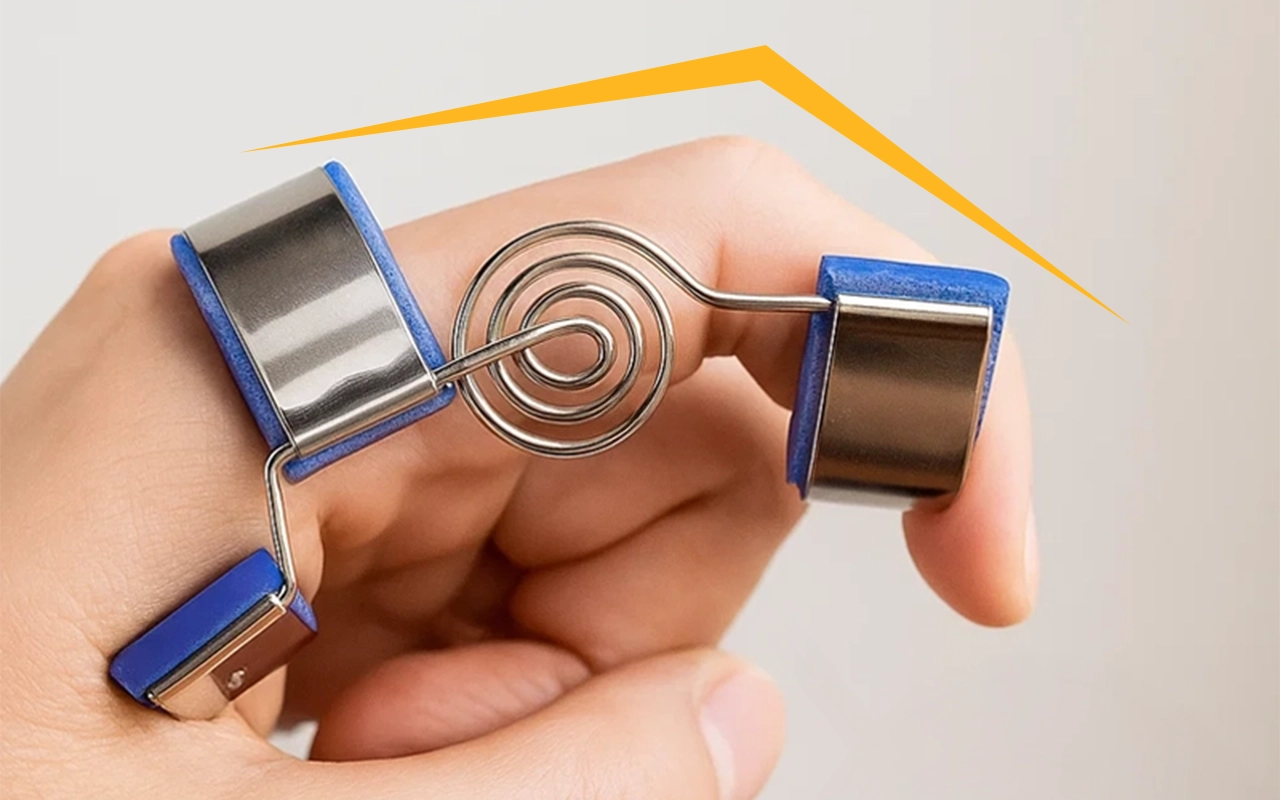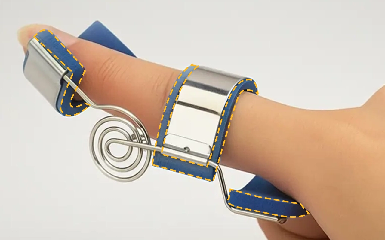 Uso isto no meu dedo anelar enquanto durmo para evitar que ele enrole. O suporte com mola permite que ele se estique suavemente, e eu acordo com menos rigidez.