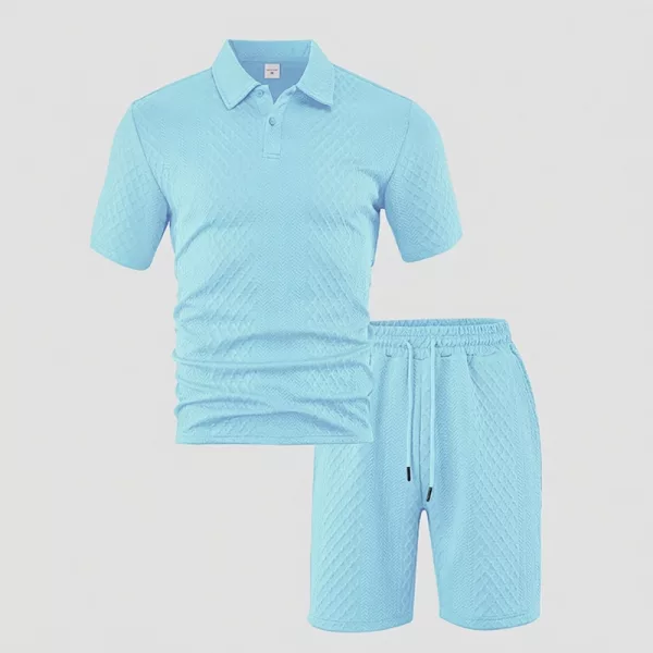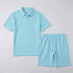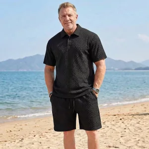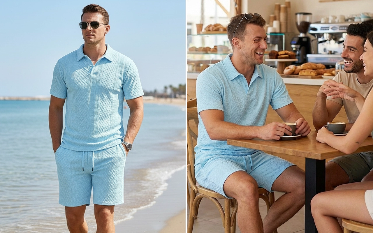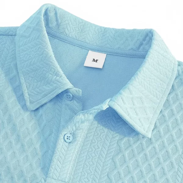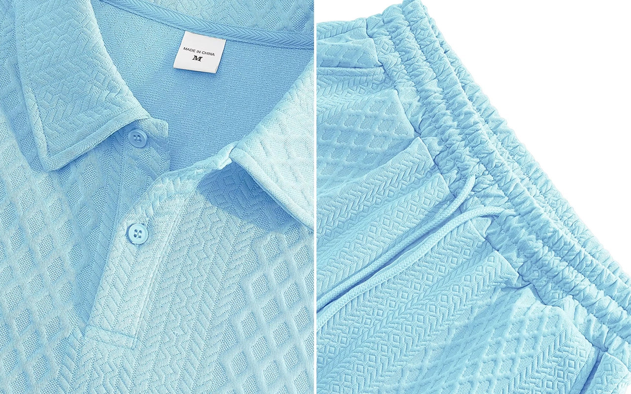 A textura jacquard e a gola lapela criam um visual elegante. Adequado para encontros ou à beira-mar, você parece sofisticado sem esforço.