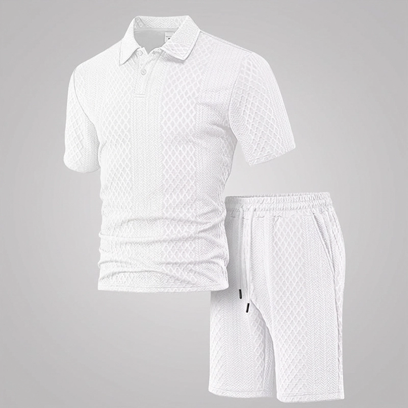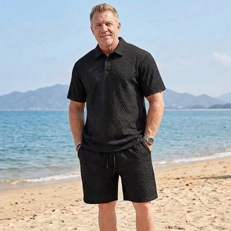 A textura jacquard e a gola lapela criam um visual elegante. Adequado para encontros ou à beira-mar, você parece sofisticado sem esforço.
