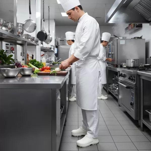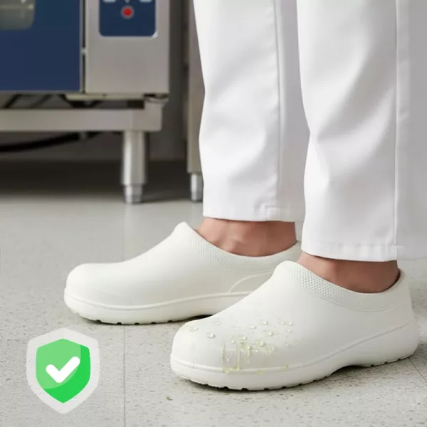 Super fácil de limpar após cada turno. Meus pés costumavam doer, mas com esses sapatos de cozinha posso ficar de pé sem dor até o fechamento.