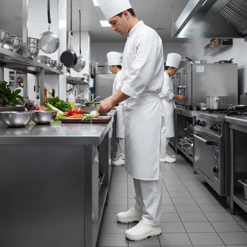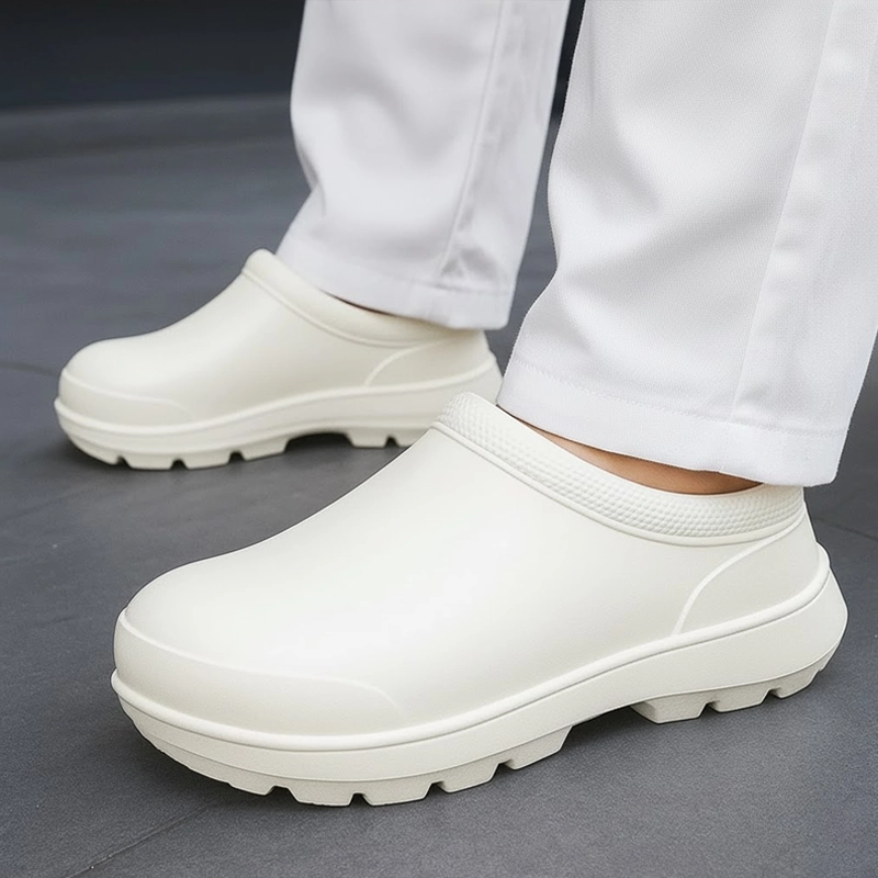Super fácil de limpar após cada turno. Meus pés costumavam doer, mas com esses sapatos de cozinha posso ficar de pé sem dor até o fechamento.