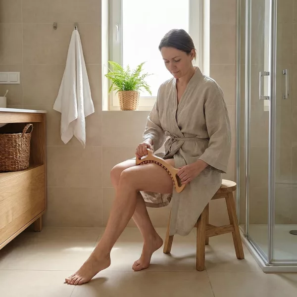Tenho usado este massageador de madeira todas as noites e minhas coxas estão mais firmes, menos inchadas, e minhas panturrilhas não doem mais depois de longos turnos.