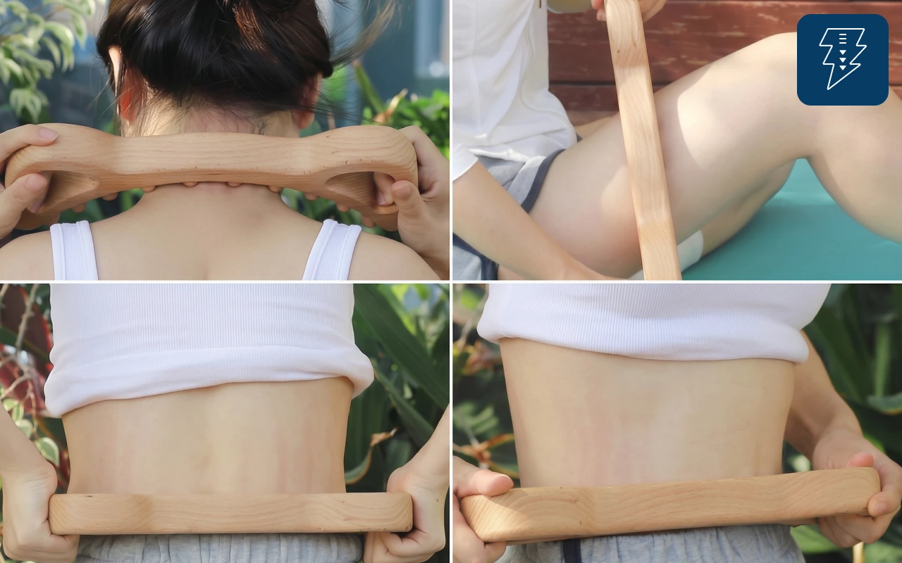 Tenho usado este massageador de madeira todas as noites e minhas coxas estão mais firmes, menos inchadas, e minhas panturrilhas não doem mais depois de longos turnos.