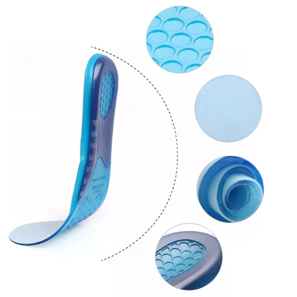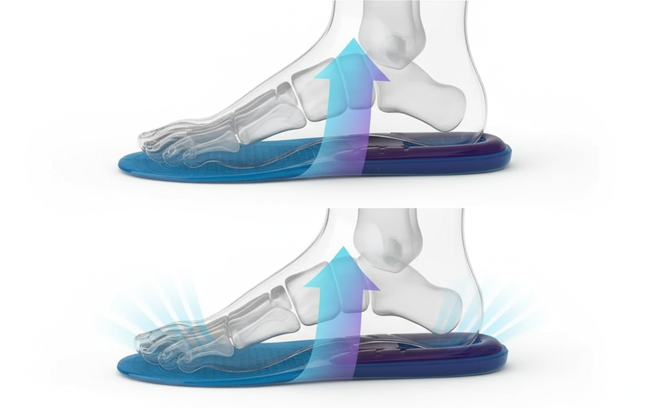 Grossas almofadas de gel de sílica suavizam cada impacto enquanto você se movimenta. Articulações e calcanhares permanecem protegidos, reduzindo o esforço diário.