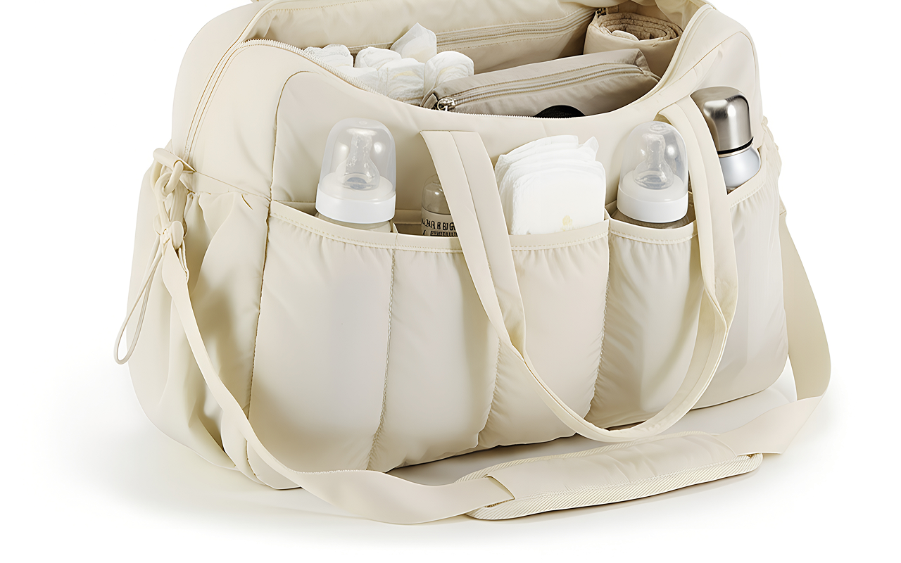 Múltiplos bolsos separam fraldas, toalhetes e mamadeiras rapidamente. Tudo fica arrumado, nada se perde ou se amassa.