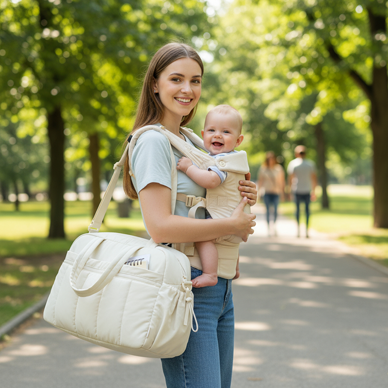 Já estava cansado de procurar por fraldas. Com esta bolsa, cada item está exatamente onde precisa estar. Fica super confortável no ombro, mesmo cheia.