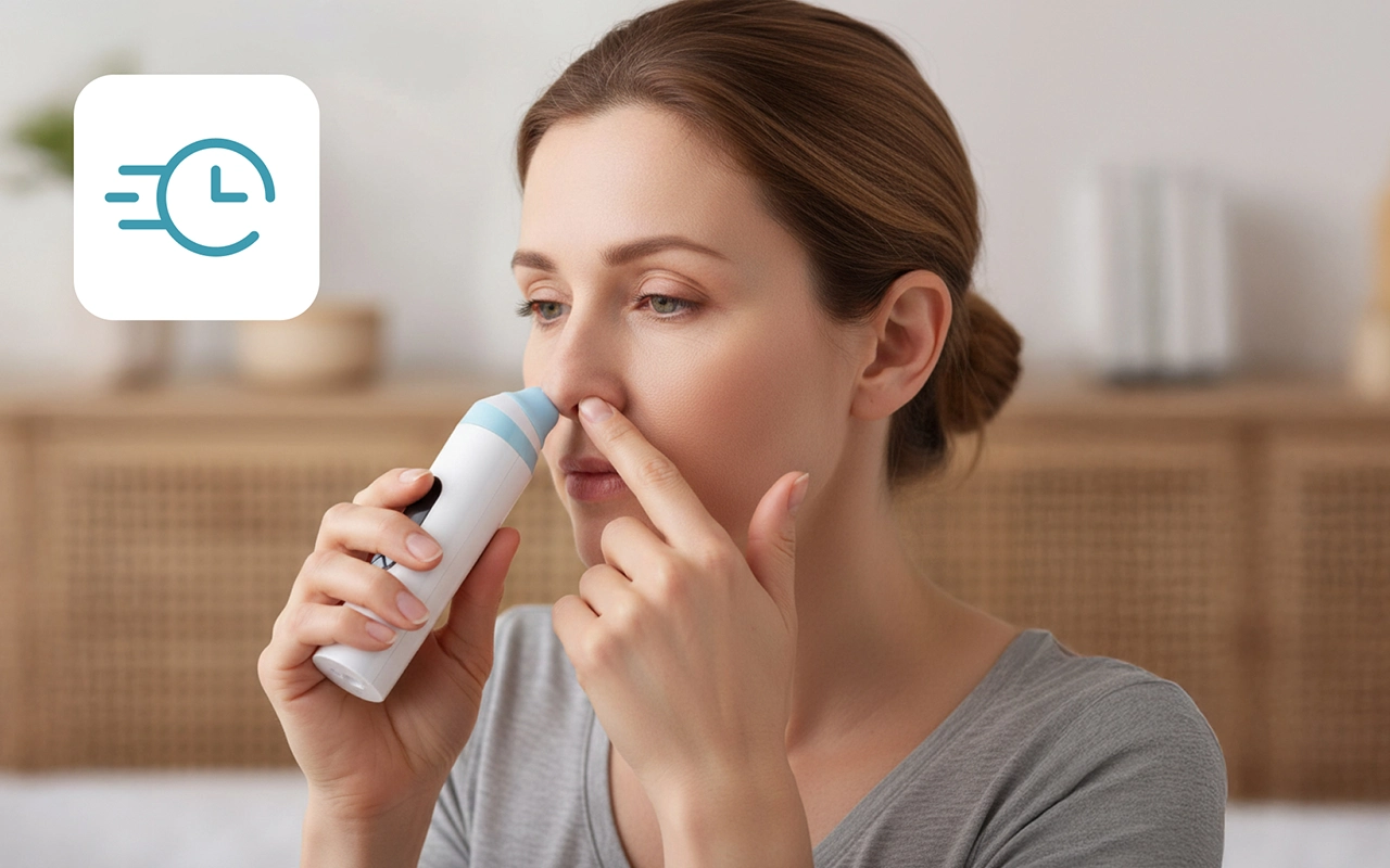 Não são necessárias gotas ou tampões para um alívio eficaz. Basta pressionar, segurar e sentir o alívio instantâneo sem complicações.