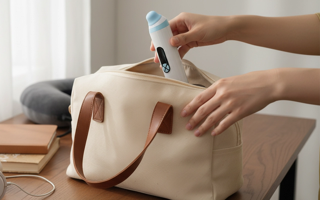 Coloque o dispositivo na bolsa para viagens diárias sem esforço. Use em qualquer lugar quando sentir pressão; não são necessárias ferramentas extras.