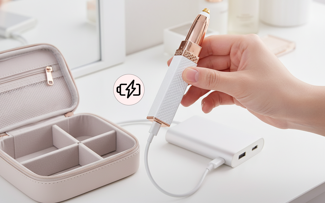 Adoro que este aparador nunca precisa de pilhas. Só carregar no USB e posso arrumar as sobrancelhas em qualquer lugar, a qualquer hora.