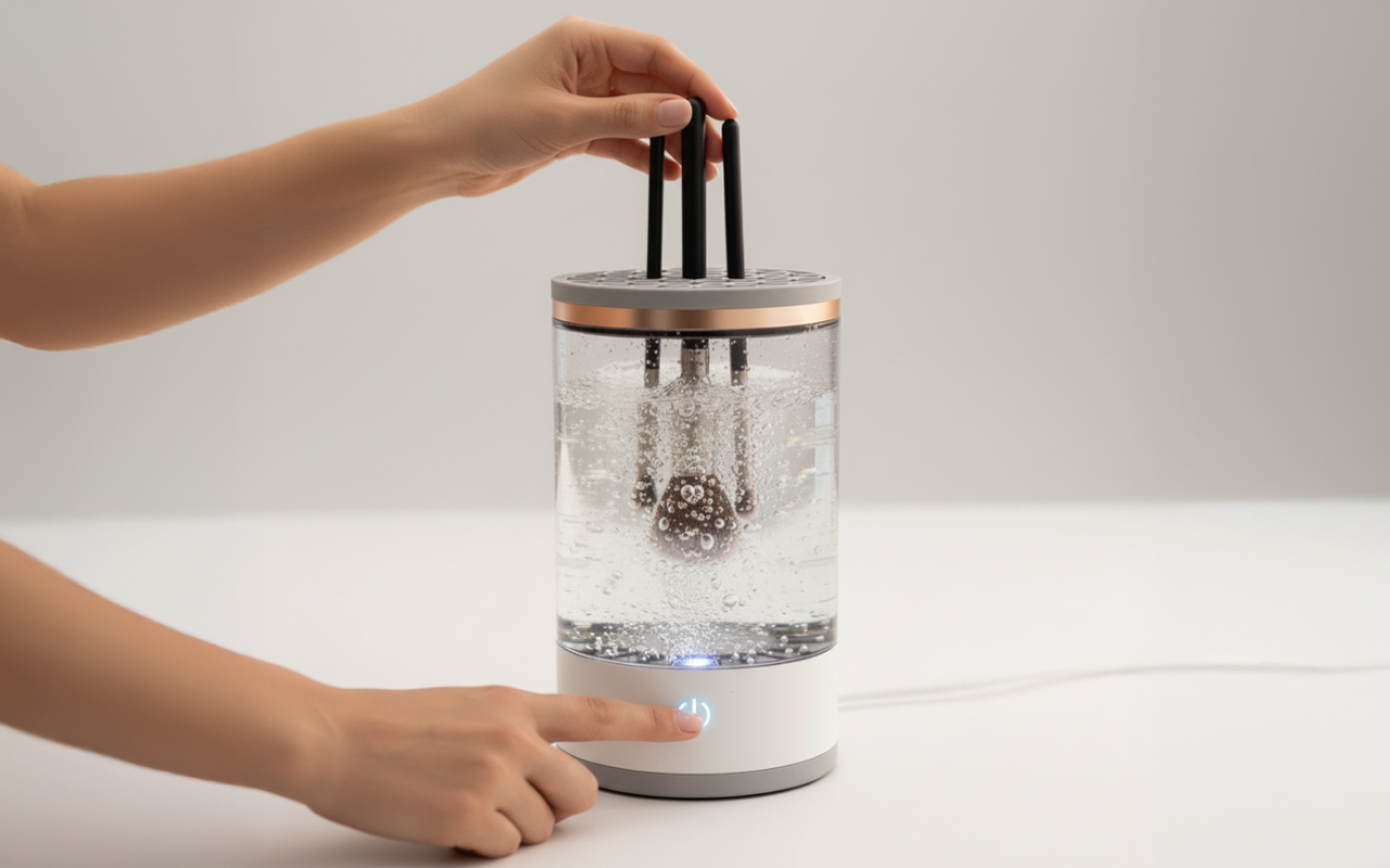 Nunca mais ficar esfregando com as mãos por tanto tempo. Agora é só clicar e pronto. Os pincéis ficam prontos quase instantaneamente e com cheiro de frescura.