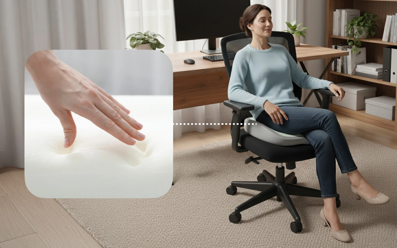 Após me recuperar de uma cirurgia, usar esta almofada realmente me ajudou a sentar confortavelmente por longos períodos. É macia, fácil de limpar e muito agradável.
