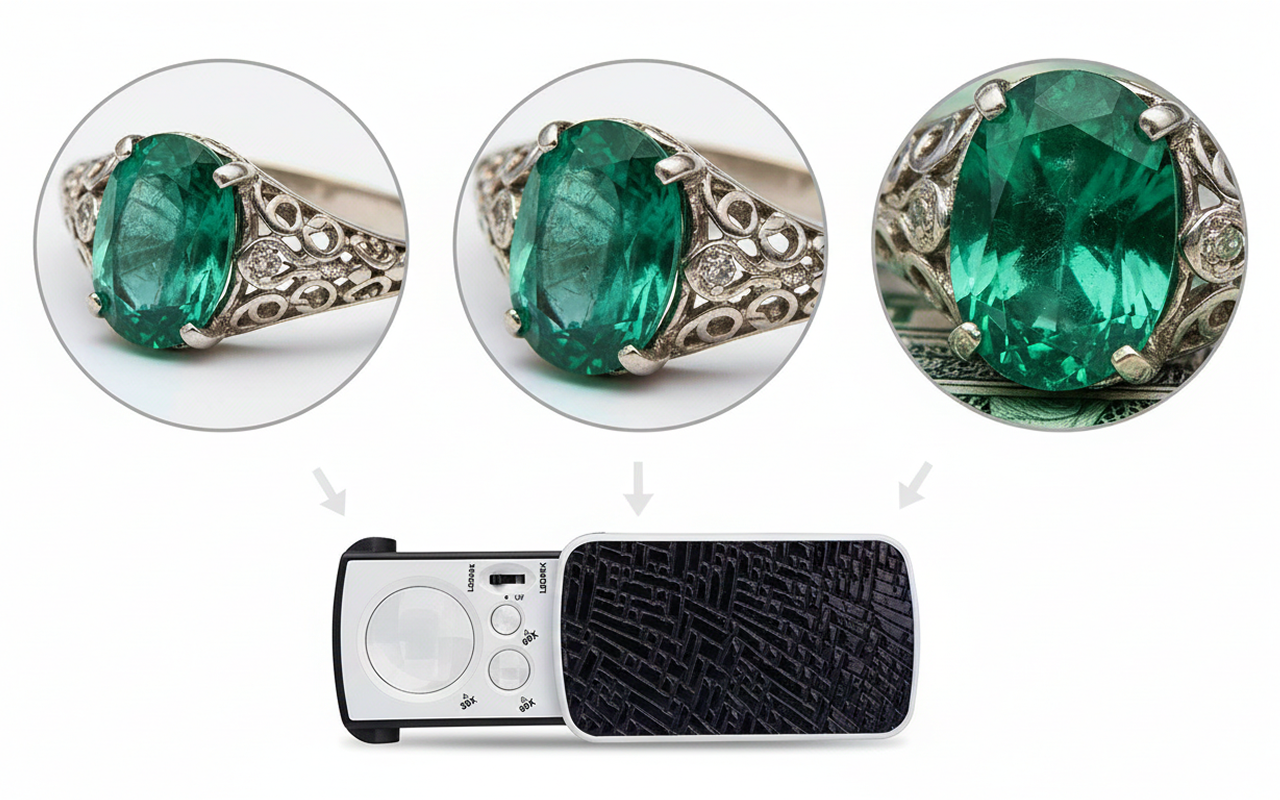 Este pequeno visor fica no meu bolso quando saio para comprar joias. Consigo ver bem de perto as garras das pedras e a luz me ajuda a avaliar a clareza ali mesmo na loja.