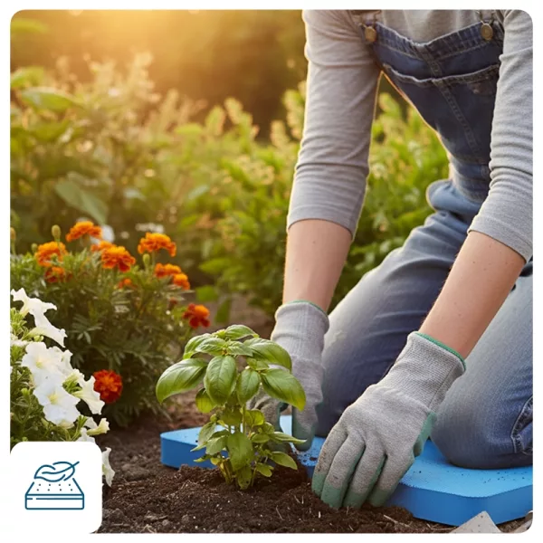 A almofada absorve a pressão de pisos ásperos ou grama úmida. Ajoelhar é suave, o que reduz dores e incômodos.