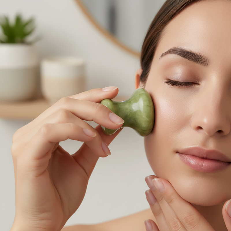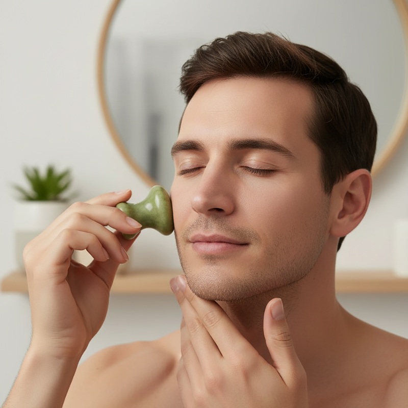 A ferramenta gua sha realmente ajuda a drenar meu rosto pela manhã. Muito fácil e posso ver mais meu maxilar e as bochechas. Até meu irmão usa às vezes.