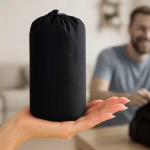 Essa almofada de pescoço tornou meus voos muito melhores. Ela fica super compacta, mas apoia minha cabeça perfeitamente. Super fácil de lavar e muito confortável.
