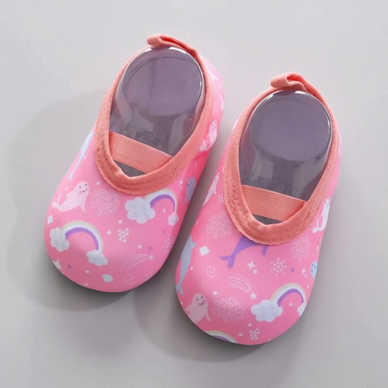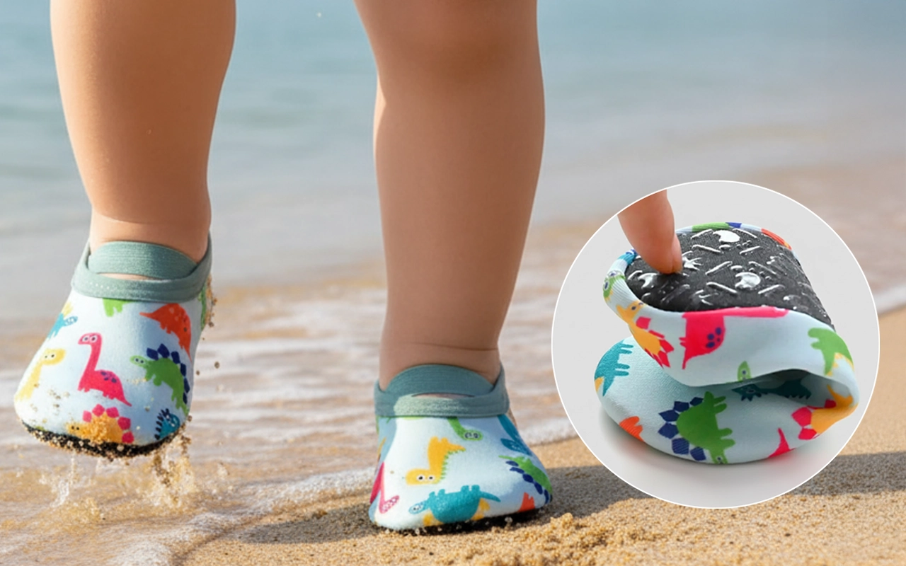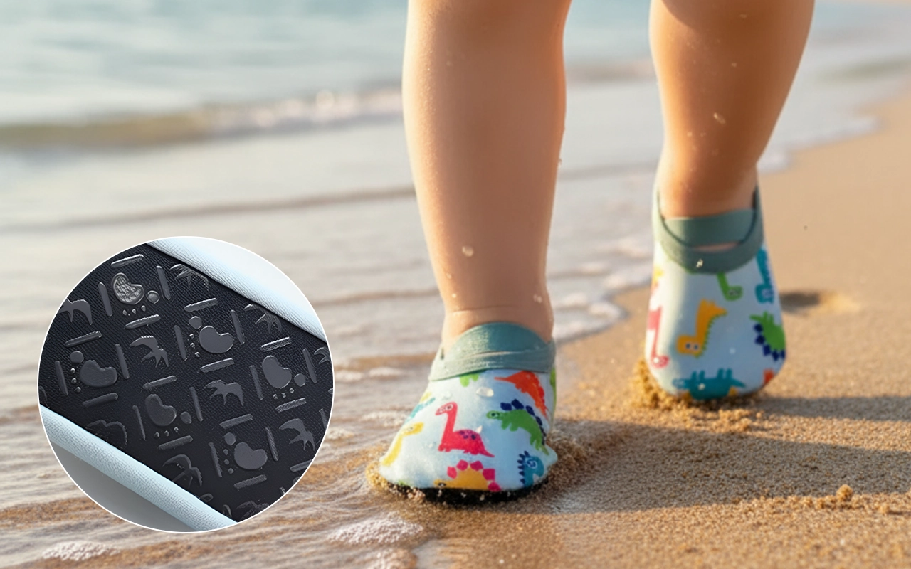 Nossos sapatos aderem firmemente a superfícies molhadas, ajudando as crianças a se manterem firmes nos pés.