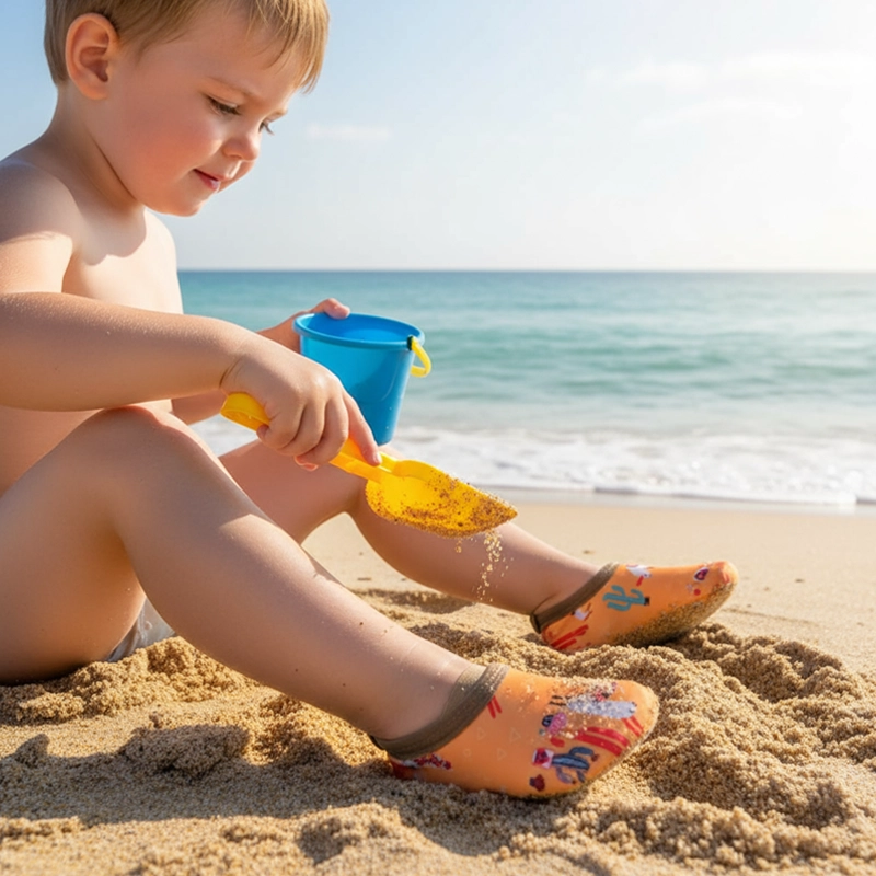 Os sapatos de praia Ortorex para crianças se adaptam a cada passo sem apertar ou machucar. As crianças podem se movimentar livremente durante a diversão na água.