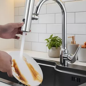 Chega de respingos! Posso alternar de um enxágue suave para frutas a um jato forte para panelas em um segundo. Até meus filhos conseguem usar.