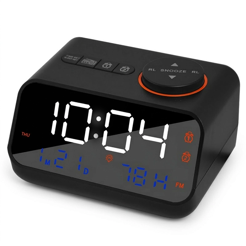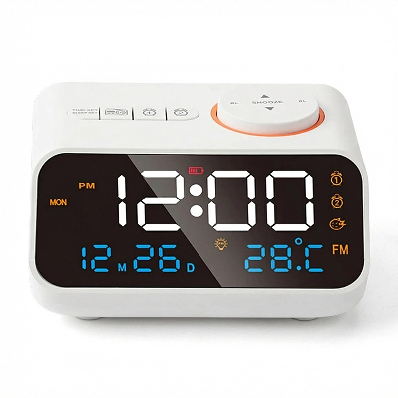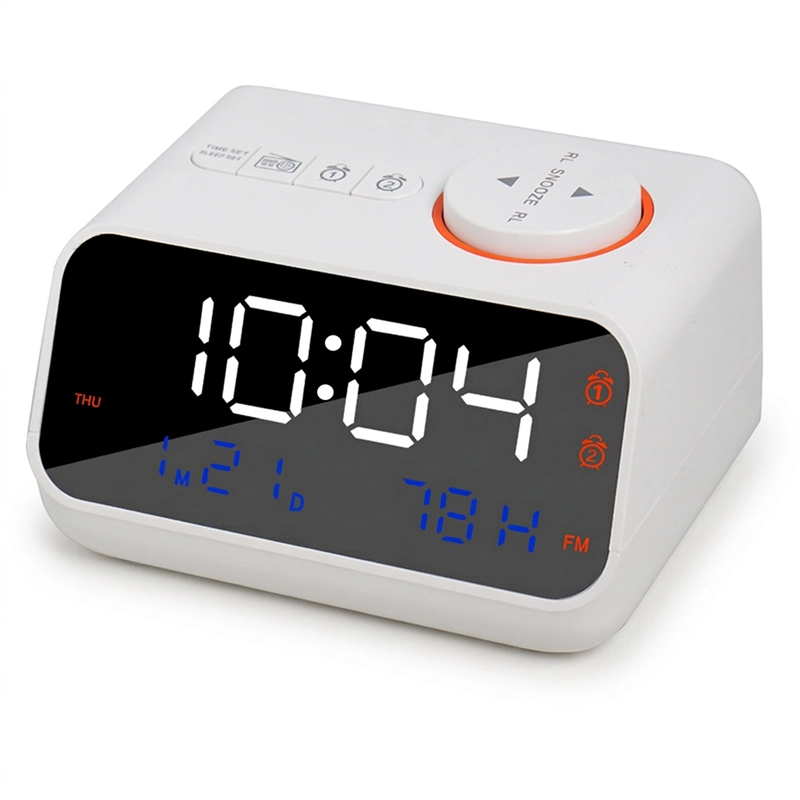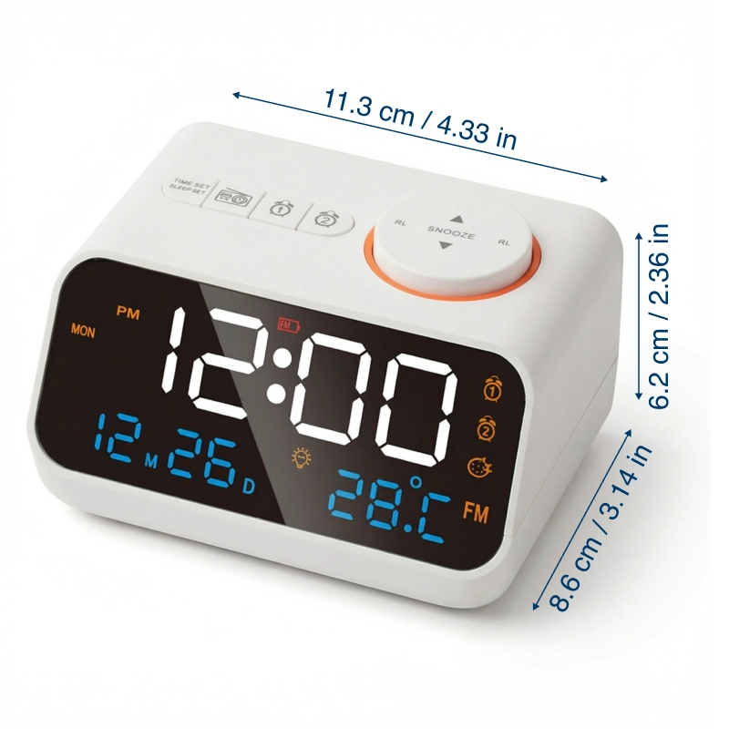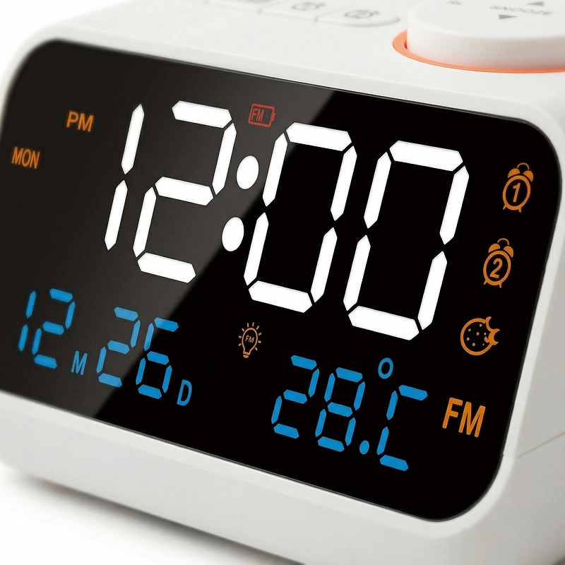 Defina dois alarmes separados para manter as rotinas simples e confiáveis. Escolha música suave ou rádio animado para acordar calmo e preparado.