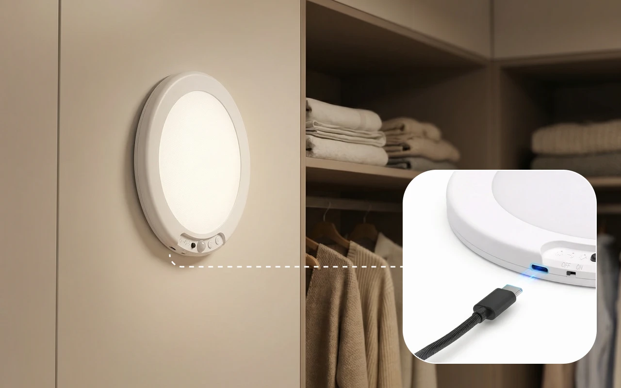Recarregue rapidamente a luminária de teto Ortorex com o cabo USB Tipo-C. Uma carga completa garante semanas de iluminação confiável.