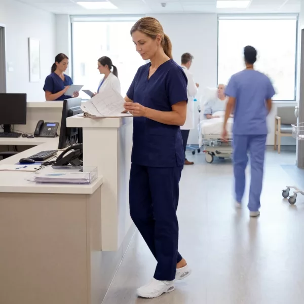 Todo o corre-corre na enfermaria já não me incomoda. O amortecimento de ar faz toda a diferença nos meus pés cansados.