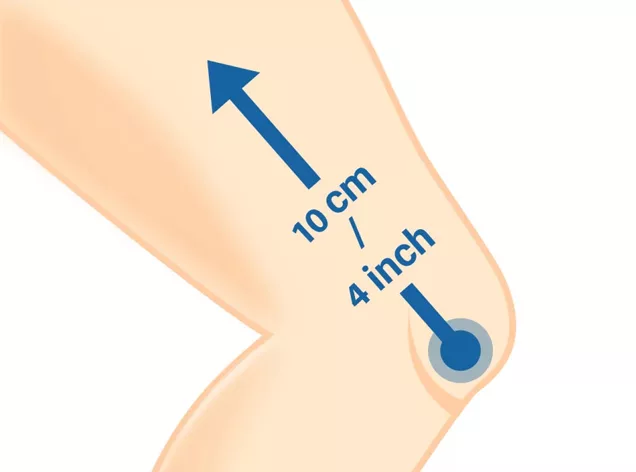 - 2. Enrole a fita métrica ao redor da parte mais larga da sua coxa, cerca de 10 cm/4" acima do meio da rótula.