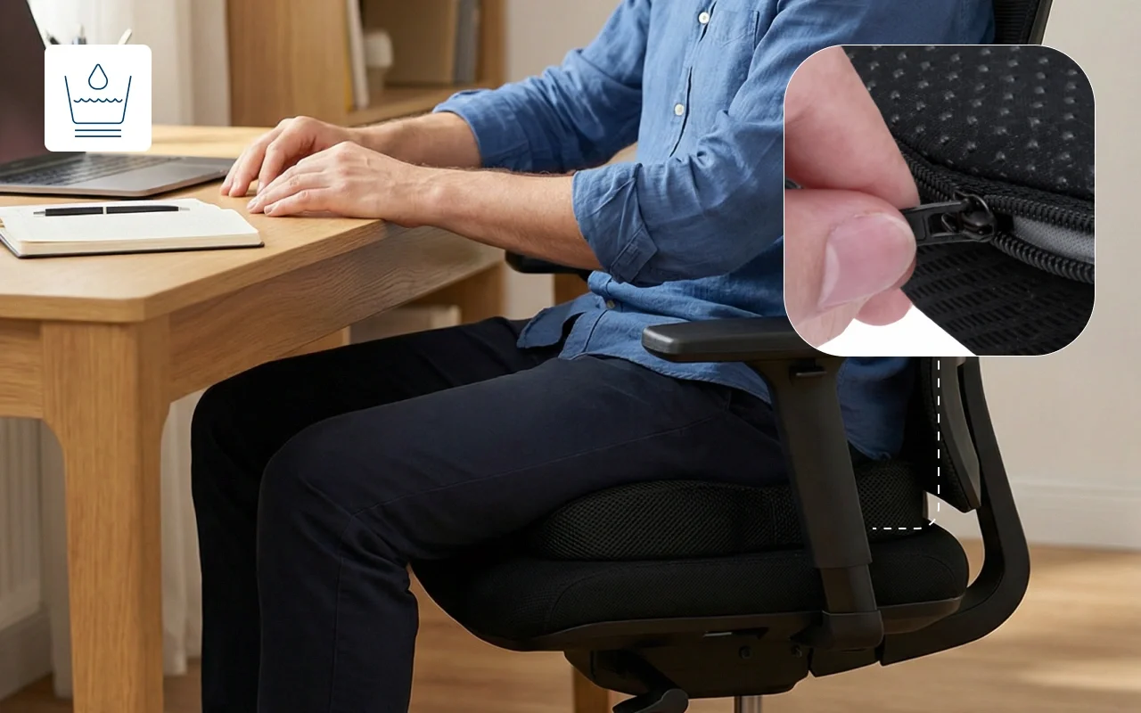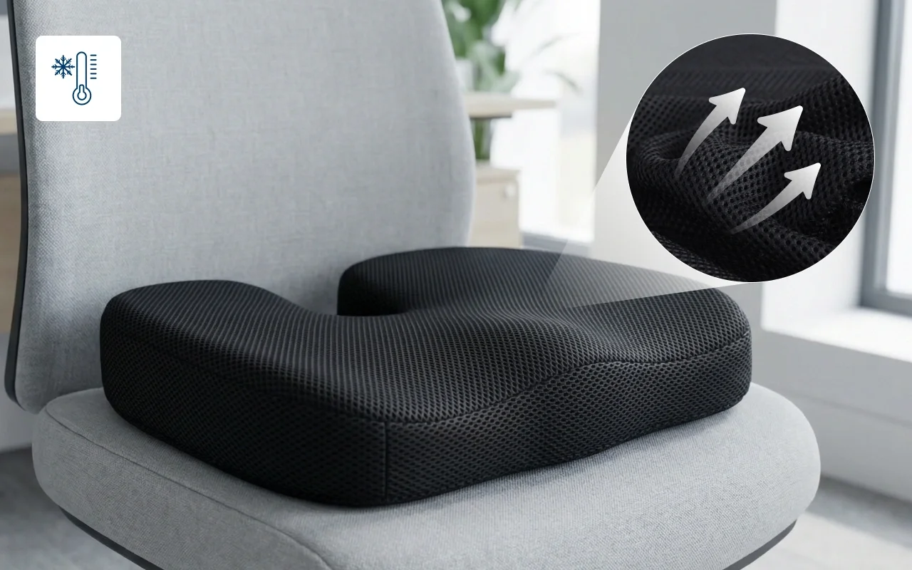 O ar circula pela capa em malha e a camada de gel permanece fresca. Chega de suar ou sentir calor enquanto fica sentado por horas.