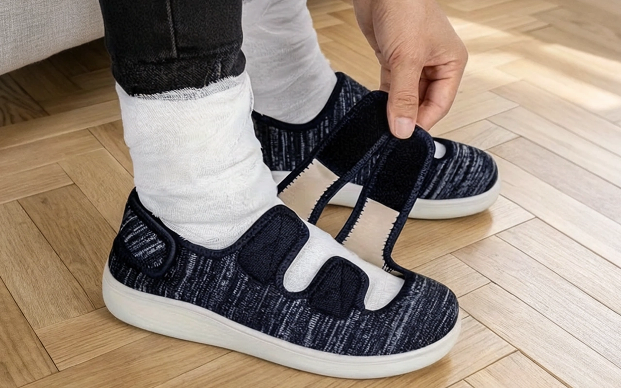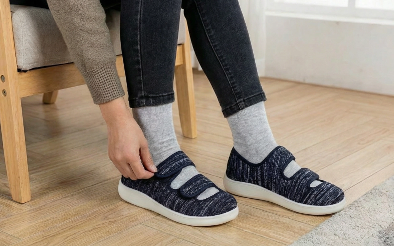 Calçá-los leva apenas alguns segundos graças ao simples design de enfiar o pé e ao fecho em Velcro. Isso economiza tempo e elimina a frustração de quem tem dificuldade para se abaixar.