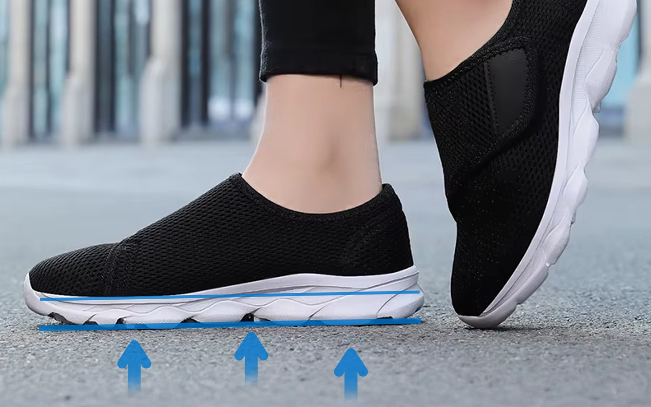 Cada passo é macio graças ao design flexível da sola. Calcanhares e arcos doloridos recebem alívio ao caminhar.