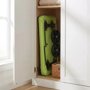 O carrinho dobra-se em um volume fino que cabe em armários estreitos. A estrutura leve pendura-se ordenadamente atrás das portas, liberando o precioso espaço do corredor.