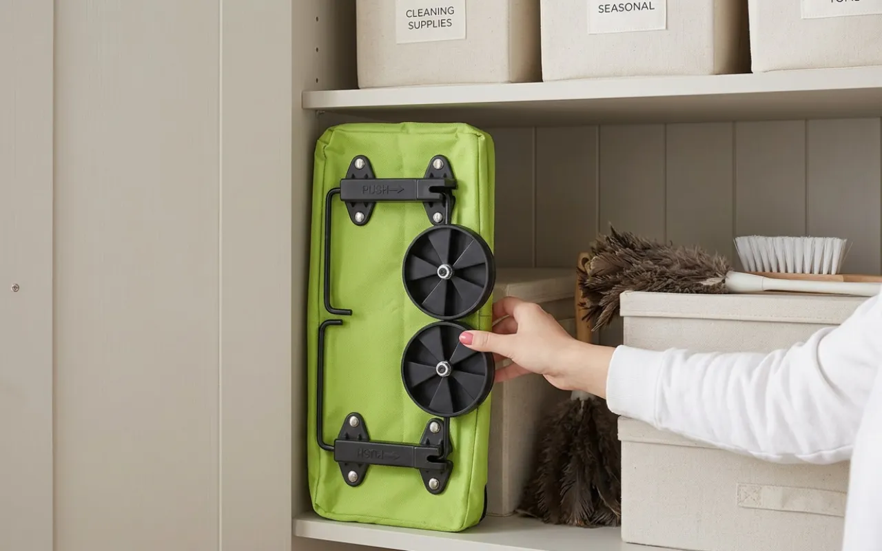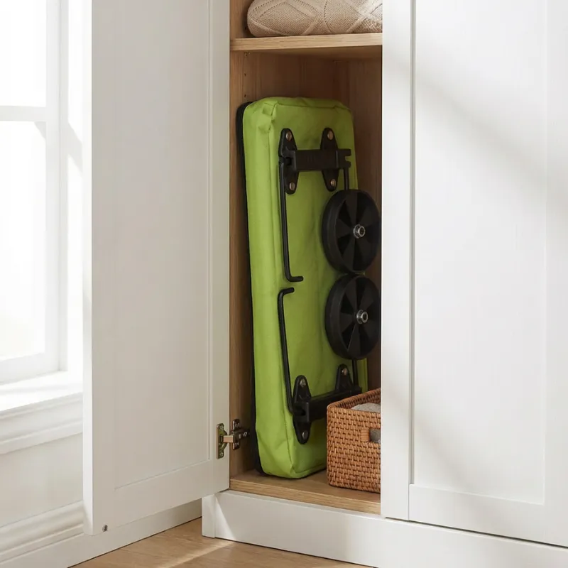 Comprei este carrinho depois de uma cirurgia ao ombro. Agora carrego garrafas pesadas e fruta sem preocupação. Dobra-se em segundos e desliza facilmente ao lado do guarda-roupa.