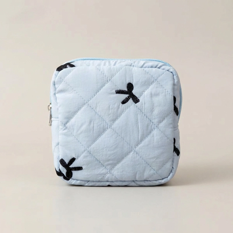 Sempre levo minha bolsinha azul comigo. Cabe absorventes, protetores e até um pequeno pacote de lenços. Realmente facilita meus dias na escola.