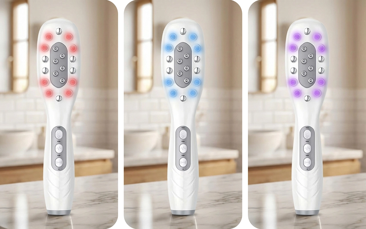Luzes vermelha, azul e roxa atendem diferentes necessidades do couro cabeludo. Esses modos ajudam a fortalecer as raízes, regenerar os folículos e reduzir a irritação rapidamente.