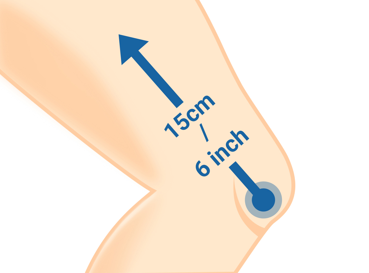 - 2. Comece a fita métrica 15 cm/6” acima do meio da rótula e estenda-a até o tornozelo.