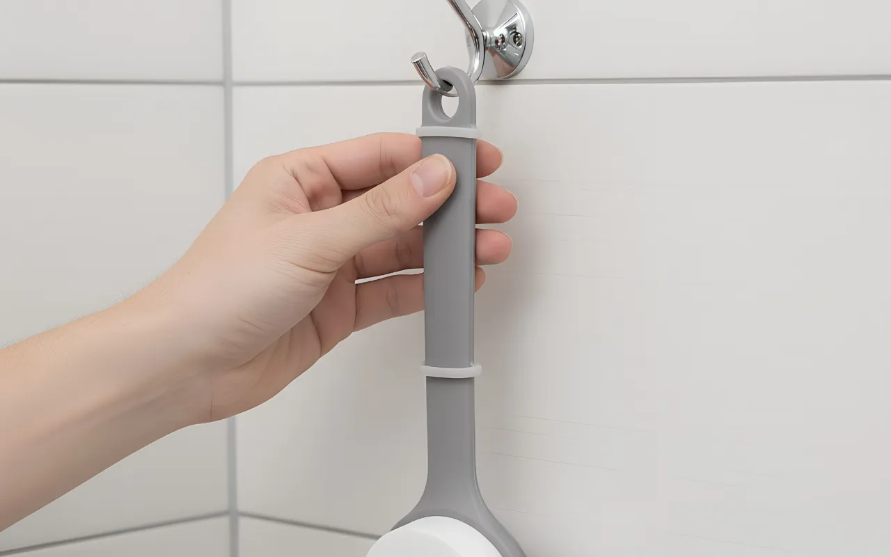 O cabo é sólido e confortável de segurar. Penduro o meu em um gancho após cada uso. Nunca tive uma escova que funcionasse tão bem nos ombros e na parte inferior das costas.