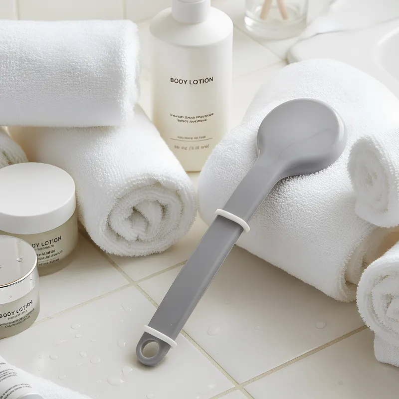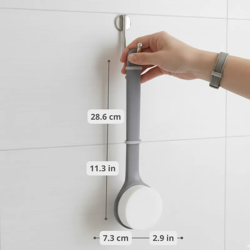 Se suas costas ficam ressecadas, isso é indispensável. Rápido de usar, fácil de guardar com o laço, e não deixo cair mesmo com as mãos molhadas.