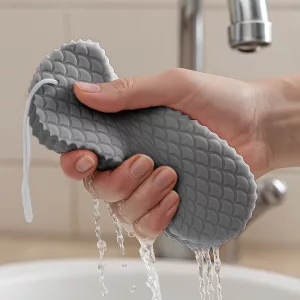 Basta enxaguar e pendurar após cada uso. O design ajuda a evitar o acúmulo e mantém a esponja fresca por mais tempo.
