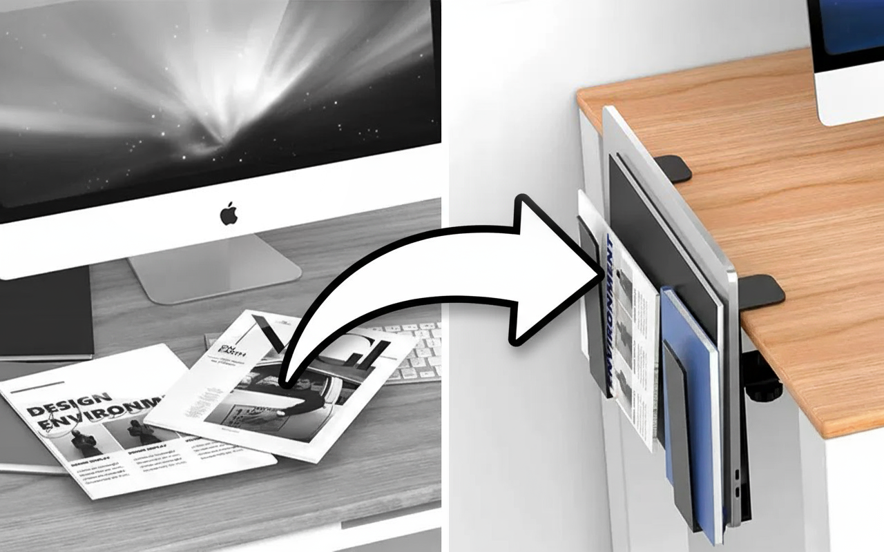Reduza a bagunça rapidamente usando um suporte inteligente ao lado da sua mesa. Aproveite mais espaço para trabalhar, digitar ou escrever sem distrações.