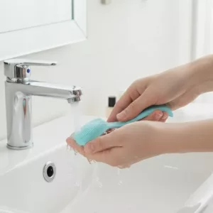 O esfoliante de pele Ortorex encaixa confortavelmente até em mãos molhadas, facilitando o uso.