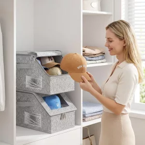 Empilhar essas caixas no armário do corredor foi a melhor ideia. Meus cachecóis e luvas finalmente não estão mais misturados, e o zíper mantém o pó fora.