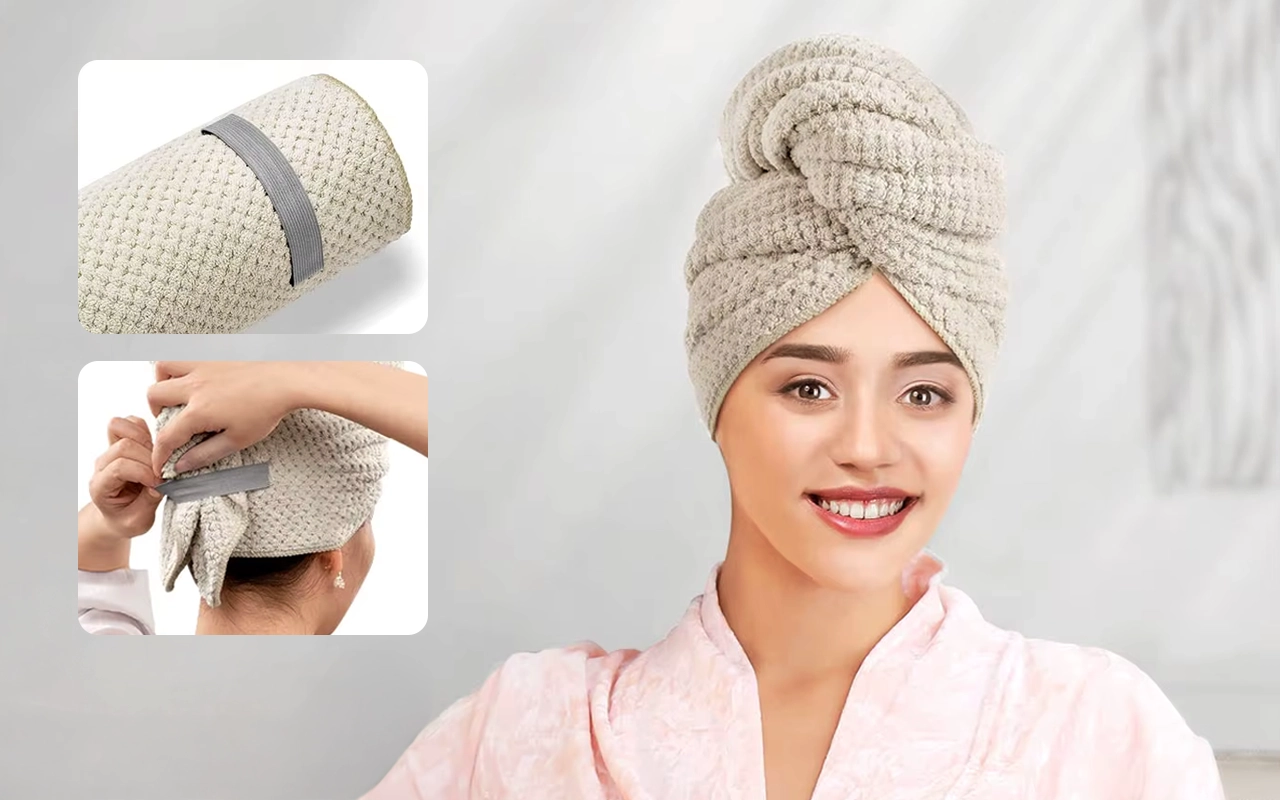 Esta toalha é tão leve! Uso toda noite. Meu cabelo nunca mais ficou arrepiado, e a faixa segura firme mesmo quando me mexo.