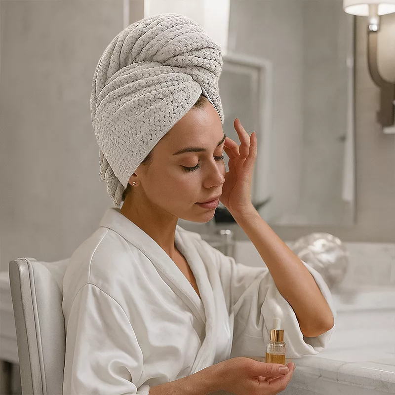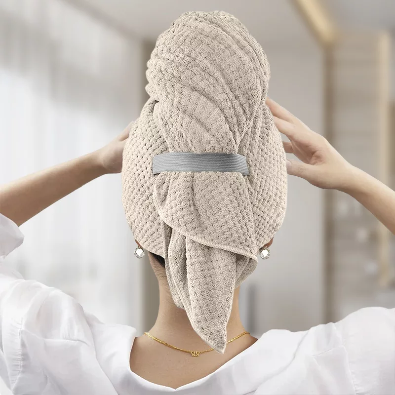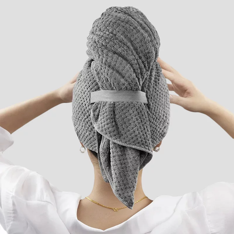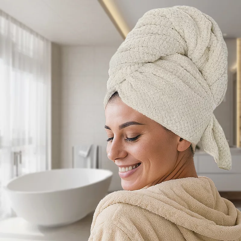 A microfibra é incrível—suave na minha cabeça e meu cabelo seca super rápido! Nunca mais partes ensopadas ou toalhas pesadas caindo. Não quero outra coisa.