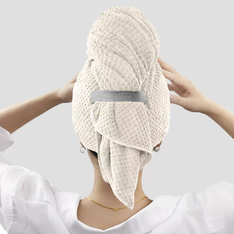 Esta toalha é tão leve! Uso toda noite. Meu cabelo nunca mais ficou arrepiado, e a faixa segura firme mesmo quando me mexo.