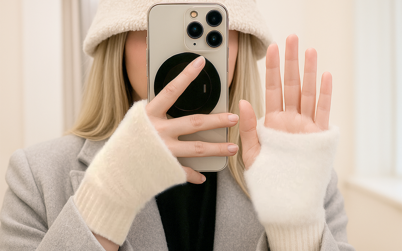 A melhor coisa é o quanto elas esticam. Não são volumosas, então consigo até colocar as mangas do casaco por cima. Muito fácil de mexer no celular.