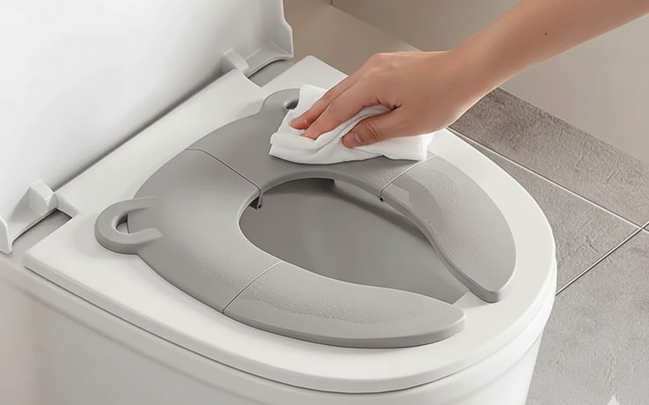 Esse piniquinho dobra e fica pequeno, então posso guardar na bolsa de fraldas. Faz com que banheiros públicos sejam muito menos assustadores para meu pequeno.