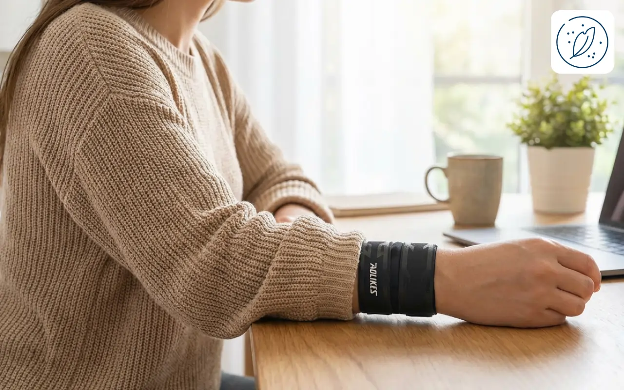 Eu faço crochê por horas e meu pulso costumava queimar. Esse suporte macio de náilon oferece compressão constante e ainda me deixa mover os dedos com facilidade.